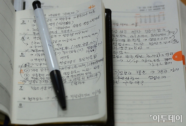 정부가 2일 개성공단 입주기업들을 대상으로 기급 유동성 지원을 위해 총 3천억 원 규모의 ‘개성공단 기업 긴급자금’을 지원하기로 했다. 이날 오후 개성공업지구 영업기업 간담회가 여의도 중소기업중앙회에서 열린 가운데 개성공단 입주기업 영업소 관계자의 수첩에 회의 관련 내용이 빼곡히 적혀 있다. 노진환 기자 myfixer@