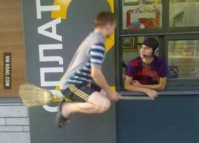 사진에는 자동차 대신 하늘을 나는 빗자루를 타고 햄버거를 사러 온 한 남성의 모습이 담겨 있다. 편안한 옷차림을 한 남성은 슬리퍼를 신은 채 빗자루를 타고 하늘을 날고 있다.