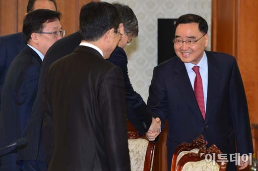 정홍원 국무총리가 3일 오전 서울 세종로 정부서울청사에서 열린 ‘국가정책조정회의’에 참석해 국무위원들과 인사를 나누고 있다. 방인권 기자 bink7119@