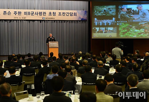 존.D 존슨 주한 미8군사령관이 3일 서울 남대문로 대한상공회의소에서 열린 조찬간담회에 참석해 한미동맹에 대해 강연하고 있다. 양지웅 기자 yangdoo@