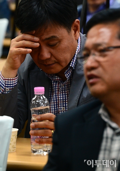 개성공단기업협회가 개성공단 조업 중단과 근로자 철수에 따른 후속 대책을 논의하기 위해 ‘개성공단 정상화 촉구 비상대책위원회’를 구성했다. 3일 오후 여의도 중소기업중앙회에서 열린 임시 총회에서 개성공단 입주 기업인이 심각한 표정으로 생각에 잠겨있다. 노진환 기자 myfixer@