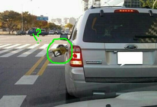 사진 속에는 도로를 달리고 있는 자동차의 모습이 담겨 있다. 그런데 자동차가 좀 이상하다. 자세히 살펴보면 이 자동차는 주유를 할 때 쓰는 주유기를 꽂은 채로 질주하고 있다.