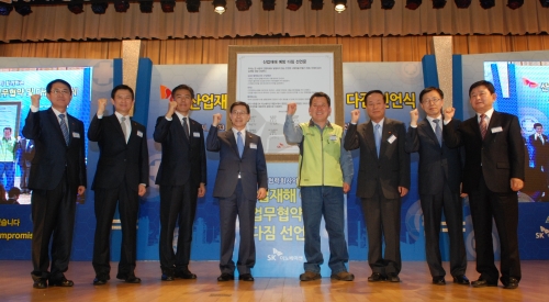 SK이노베이션은 6일 SK에너지 울산콤플랙스(CLX)에서 ‘협력회사와 함께 하는 산업재해 예방 업무협약 및 다짐 선언식’을 열고, 안전보건공단 및 울산시와 업무 협약을 체결했다고 밝혔다.