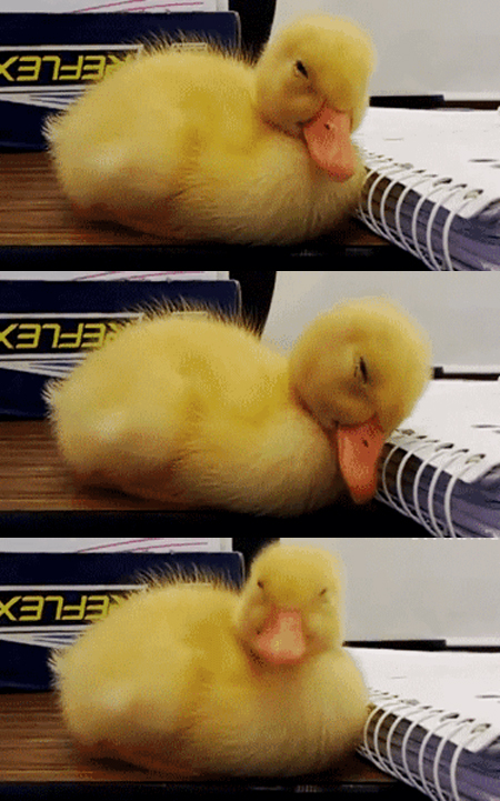 사진 속에는 책 옆에 앉아 있는 새끼 오리가 졸음을 참다 잠을 이기지 못하고 머리를 떨구는 모습이 담겨 있다. 특히 잠에서 깬 오리가 잠을 떨쳐내려는 듯한 모습이 네티즌들의 공감을 얻었다.