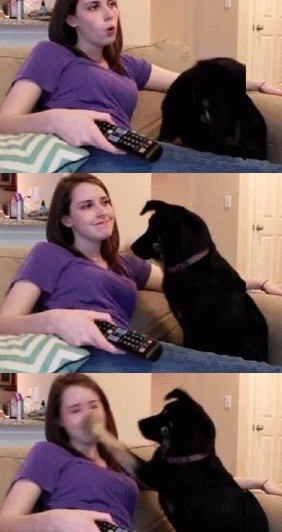 주인으로 보이는 여성이 개에게 바람을 부는 장난을 치고 미소를 짓자 개가 갑자기 고개를 돌리며 발로 주인의 뺨을 때린다. 마치 여성의 입냄새가 싫어 개가 화가 난 것처럼 보인다는 점이 폭소를 유발한다.