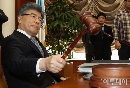 김중수 한국은행 총재가 9일 오전 서울 중구 남대문로 한국은행 본관에서 열린 ‘금융통화위원회 본회의’에서 의사봉을 두드리고 있다. 방인권 기자 bink7119@