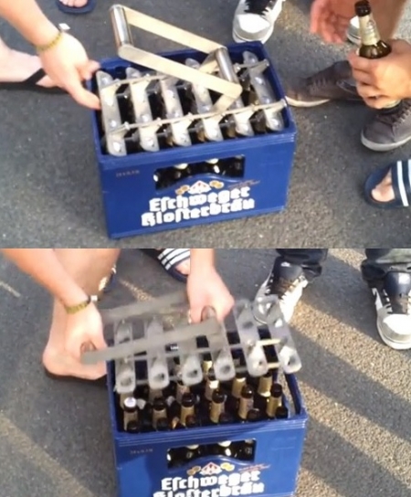 이 게시물 속에서는 24개의 병을 한 번에 딸 수 있도록 고안된 특수한 병따개로 한 박스 분량의 맥주 병뚜껑을 한번에 따는 모습이 담겨있다.