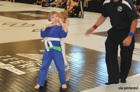 사진에는 파란색 도복을 입은 남자 아이가 흰색 도복을 입은 아이로부터 뒤에서 목조르기를 당하고 있다. 당장이라도 목을 꺾어 버릴 것 같은 흰색 도복 아이의 몸짓에 파란색 도복의 아이가 당황한 표정을 짓고 있다.