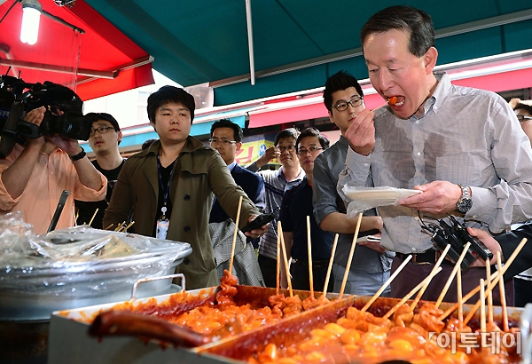 허창수 전경련 회장이 12일 오후 서울 대림동 우리시장을 방문해 떡볶이를 시식하고 있다. 노진환 기자 myfixer@