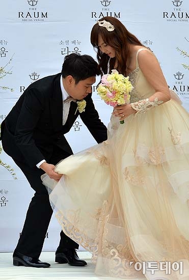 셰프 레이먼 킴이 13일 오후 서울 강남구 역삼동 더 라움에서 열린 결혼식 기자회견에서 신부 김지우의 드레스 정리를 도와주고 있다 . 방인권 기자 bink7119@