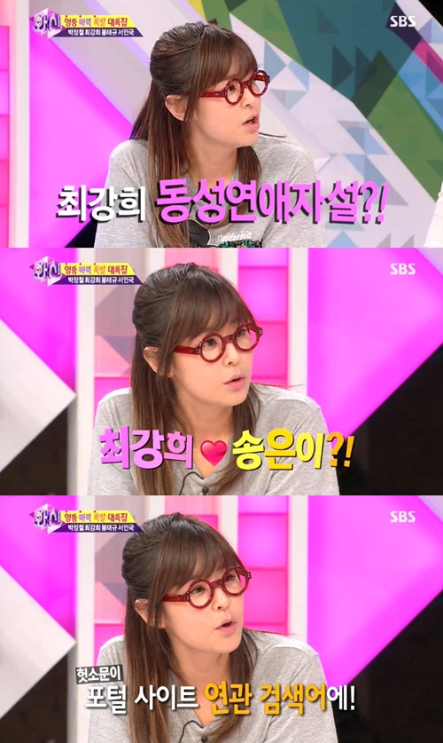 최강희는 송은이와 사귄다는 소문에 대해 "(레즈비언이) 연관 검색어로 떠서 계속 지우고 지우고 하고 있다"며 "소문이 나한테는 안 오고 검색어가 자꾸 뜨더라. 레즈비언 인기투표에서 내가 5위 안에 든다"고 말했다.