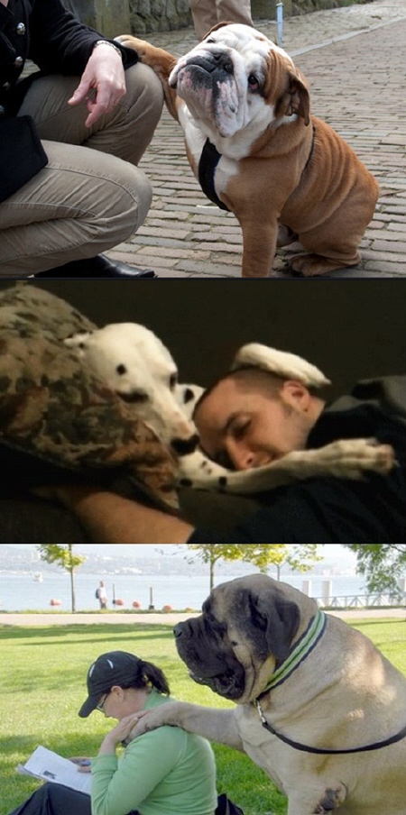 최근 온라인 게시판에는 '주인 위로하는 개'가 올라왔다. 공개된 사진 속에는 개들이 주인을 다독이는 모습이 담겨 있다. 주인 위로하는 개는 주인의 무릎에 앞발을 올리거나 주인을 품에 안은 채 앞발로 주인의 머리를 쓰다듬고 있다. 잔디밭에 앉아 있는 주인의 뒤에 서서 어깨에 발을 올리고 있는 모습도 있다.