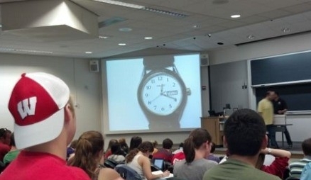 사진 속 강의실은 시계가 없고 대신 프로젝터가 손목시계를 비추고 있다. 학생들은 시계가 아닌 강의실 앞 스크린에 나타나 있는 손목시계를 보고 시험을 치루고 있다.