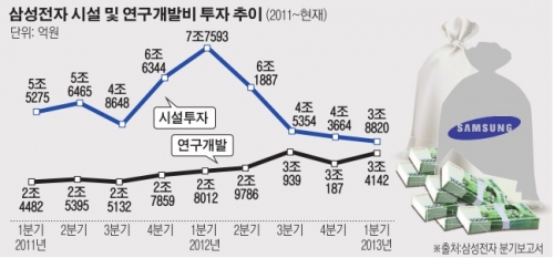 20일 삼성전자 1분기 보고서에 따르면 삼성전자는 지난 1분기 시설 투자비용으로 3조8820억원, 연구개발(R&D) 비용으로 3조4142억원을 투입한 것으로 나타났다.