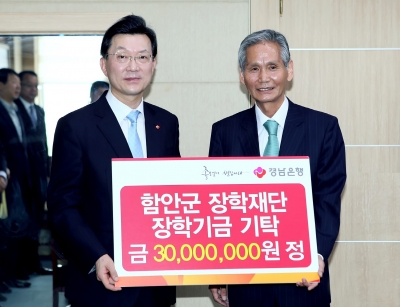 박영빈 은행장은 이날 오전 함안군청을 방문해 하성식 군수에게 ‘장학기금 증서’를 전달했다. 경남은행이 출연한 3000만원의 장학기금은 함안군 장학재단이 추진하는 인재육성사업 재원(학자금·연구비·교육여건 개선사업비 등)으로 쓰일 예정이다.