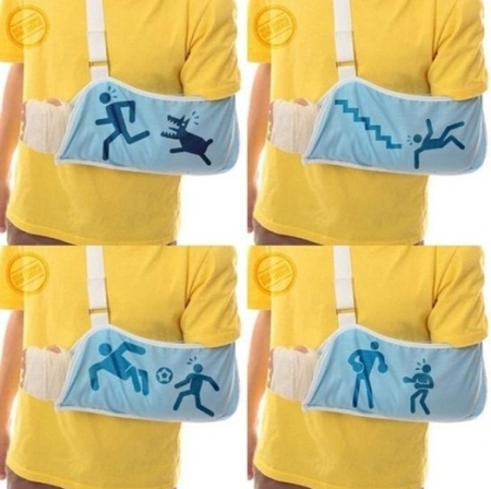 사진 속에는 개에게 물리는 모습, 계단서 굴러떨어진 모습, 축구를 하는 모습, 싸움을 하는 모습 등이 그림으로 묘사돼 깁스를 한 이가 왜 다쳤는지를 알 수 있게 했다.