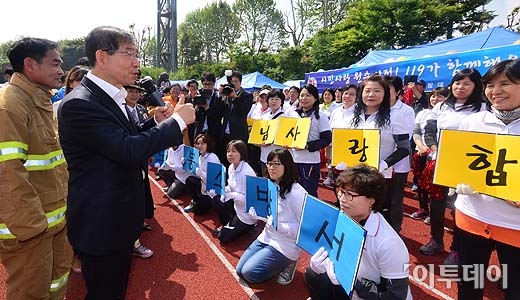 박원순 서울시장이 20일 오후 서울 송파구 잠실종합운동장 보조경기장에서 열린 서울시 의용소방대 ‘2013년 종합소방기술경연대회’에 참석해 소방관 및 의용소방대원들을 격려하고 있다. 방인권 기자 bink7119@