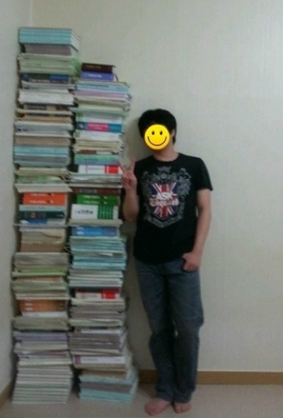 사진에는 방 한 구석에 책들이 차곡차곡 쌓여 있는 모습이 담겨 있다. 특히 두 줄로 쌓인 책들의 높이가 사진 속 성인 남자의 키를 훌쩍 넘어 눈길을 끈다.
