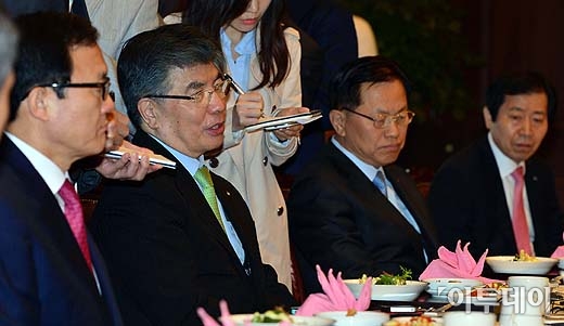 김중수 한국은행 총재가 22일 오전 서울 중구 남대문로 한국은행 본관에서 열린 ‘2013년 5월 금융협의회’에서 시중 은행장들과 이야기를 나누고 있다. 방인권 기자 bink7119@