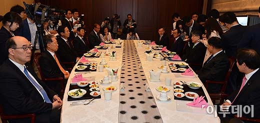 김중수 한국은행 총재가 22일 오전 서울 중구 남대문로 한국은행 본관에서 열린 ‘2013년 5월 금융협의회’에서 시중 은행장들과 이야기를 나누고 있다. 방인권 기자 bink7119@