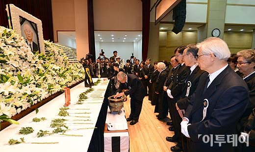 고(故) 남덕우 전 국무총리 영결식이 22일 오전 서울 동작구 국립서울현충원 현충관에서 사회장으로 열렸다. 유족들이 고인에 대한 예를 올리고 있다. 방인권 기자 bink7119@