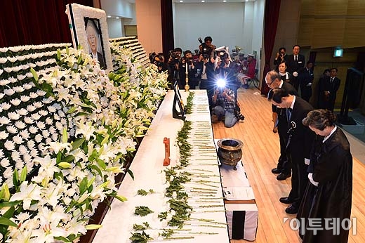 고(故) 남덕우 전 국무총리 영결식이 22일 오전 서울 동작구 국립서울현충원 현충관에서 사회장으로 열렸다. 한덕수 무역협회장 부부와 이홍구 전 총리가 참배를 하고 있다. 방인권 기자 bink7119@