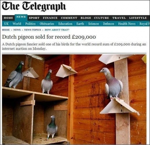 영국 텔레그래프 등 주요 외신은 "지난 1월 네덜란드의 한 비둘기 애호가가 자신의 비둘기를 중국 선박 업계 거물 후첸위에게 25만400유로(약 3억7000만원)에 팔았다"고 보도했다.