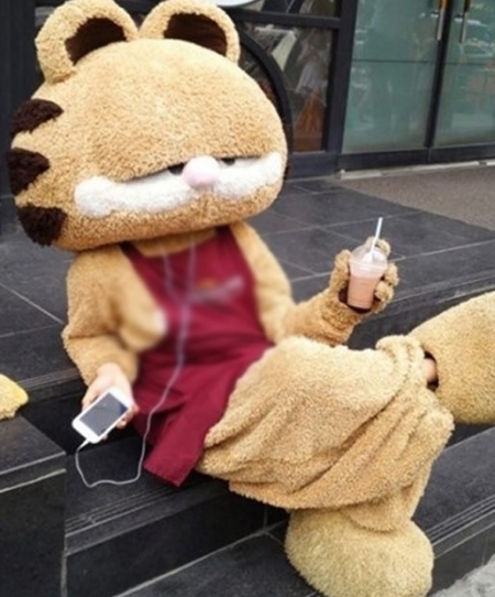 이 사진에는 인형탈을 쓴 한 알바생이 편한 자세로 앉아 음료수를 들고 음악을 듣고 있는 모습이 담겨 있다. 특히 알바생의 여유가 느껴지는 자태가 보는 이들로 하여금 웃음을 자아낸다.