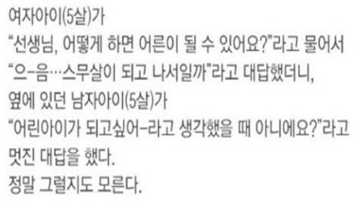 게재된 글에는 5살 아이들과 선생님이 대화한 내용이 담겨 있다. 먼저 5살 여자아이가 “어떻게 하면 어른이 되냐”고 선생님에게 물었다. 이에 선생님은 "음, 스무 살이 되고 나서일까"라고 답한다.