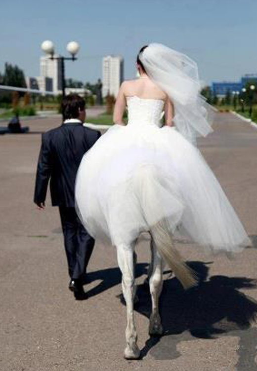 사진 속에는 흰 드레스를 입은 청순한 신부가 면사포를 휘날리며 지나가는 뒷모습이 담겼다. 하지만 자세히 보면 다리가 말다리다. 여자가 말위에 앉아 있는 것으로 언뜻 보면 착시를 일으키는 반전 사진이다.