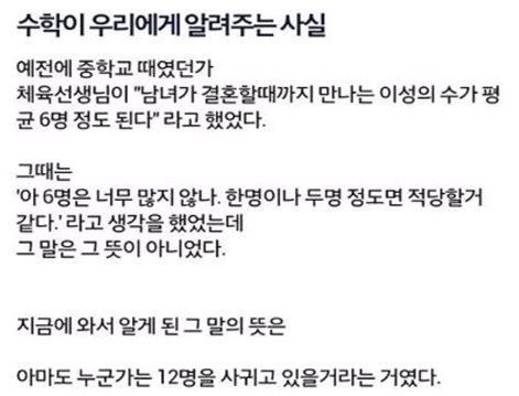 최근 온라인 커뮤니티에는 ‘평균의 비밀’이라는 제목의 게시물이 올라왔다. 게시물 속 ‘수학이 우리에게 알려주는 사실’이라는 글은 ‘평균’의 수학적 의미를 연애에 적용시켰다.
