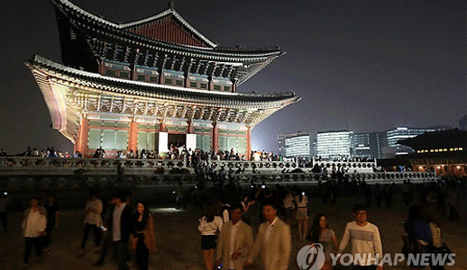 지난 22일 시작된 경복궁 야간개장이 사전 인터넷 예매가 매진될 정도로 폭발적인 반응을 보이고 있다. 관람시간은 오후 6시30분부터 10시까지이며 오는 26일까지 진행된다. 사진은 야간개장 불빛에 드러난 광화문, 흥례문, 근정문, 근정전, 수정전, 경회루의 모습을 슬라이드로 제작한 것이다.