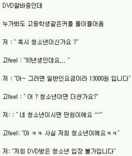 사진 속 게시글에 따르면 아르바이트생은 누가 봐도 고등학생처럼 보이는 커플이 들어오자 “혹시 청소년이신가요?”라고 물었고 청소년 커플은 “93년생인데요”라고 답했다. 그러자 아르바이트생은 “그렇다면 일반인 요금이라 1만3000원입니다. 청소년이면 요금이 1만원”이라고 말했다. 이에 커플은 “사실 저희 청소년이에요”라고 밝혔고 아르바이트생은 기다렸다는 듯이 “저희 DVD방은 청소년 입장 불가입니다”라고 말하며 이들을 돌려보낸다.