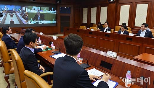 현오석 경제부총리(화면)가 27일 오후 정부세종청사와 서울청사에서 첫 영상회의로 열린 ‘경제관계장관회의’에서 모두발언을 하고 있다. 방인권 기자 bink7119@