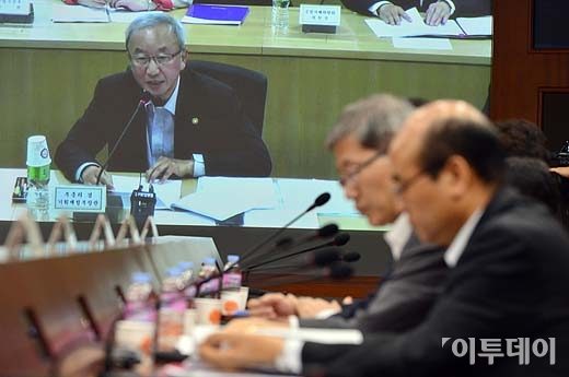 현오석 경제부총리(화면)가 27일 오후 정부세종청사와 서울청사에서 첫 영상회의로 열린 ‘경제관계장관회의’에서 모두발언을 하고 있다. 방인권 기자 bink7119@