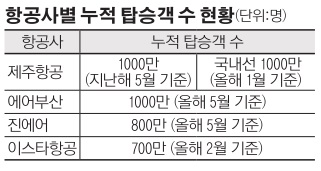 28일 관련업계에 따르면 제주항공이 국내 최초로 지난해 5월 누적 탑승객 1000만명을 기록한 데 이어 에어부산이 지난 23일 1000만명을 돌파했다. 이는 에어부산이 취항한 지 4년6개월 만에 이뤄진 기록으로 해마다 평균 100%를 웃도는 수송 성장률을 보인 결과다. 실제로 에어부산은 2009년 9월 탑승객 100만명을 달성했고 1년 뒤인 2010년 9월 300만명을 돌파했다.