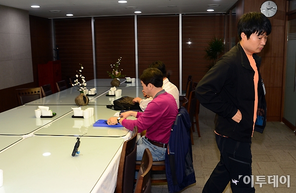 이창섭 남양유업대리점협의회 회장이 28일 오후 여의도 국회 의원회관에서 3차 교섭을 위해 남양유업 측을 기다리다 협상 결렬을 선언하고 자리에서 일어나고 있다. 남양유업 측은 국회 의원회관이 아닌 제 3의 공간에서 남양유업대리점협의회 측을 기다리는 것으로 알려졌다. 노진환 기자 myfixer@