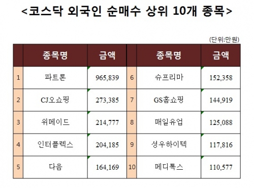 [코스닥 외국인 순매수 상위 10개 종목]