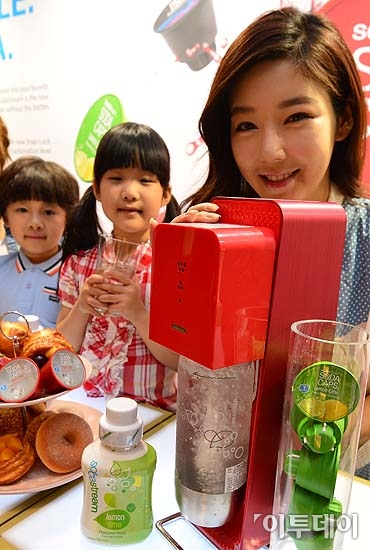 이스라엘 탄산수 제조회사인 소다스트림이 29일 오전 서울 중구 소공동 웨스틴 조선호텔에서 디자인과 편의사항을 한 단계 높인 신제품 ‘소스’를 선보이고 있다.