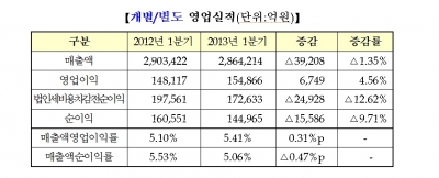 2일 한국거래소와 한국상장회사협의회가 공동 발표한 ‘코스피시장 12월 결산법인 2013사업연도 1분기 실적(K-IFRS 기준)에 따르면 ‘2013년 1분기보고서 제출대상 12월 결산 코스피시장 상장법인 663사 중 분석제외법인 38사를 제외한 625사의 개별·별도 기준 매출액은 전년 동기 대비 1.35% 감소, 영업이익은 4.56% 증가한 반면 순이익은 9.71% 감소했다.