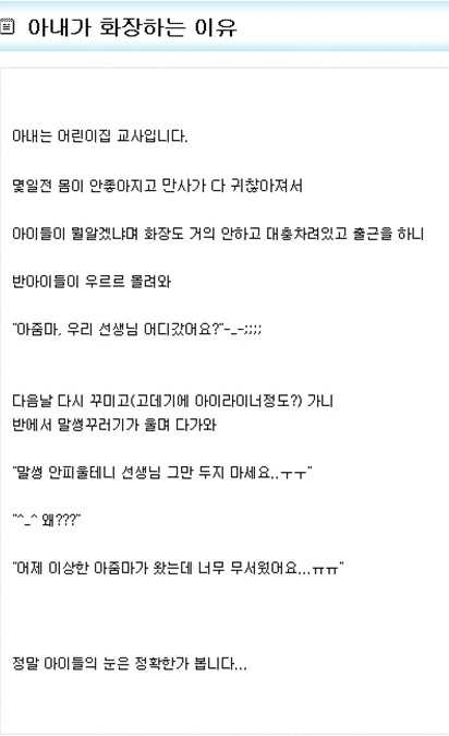 글쓴이는 "아내는 어린이집 교사다. 며칠 전 몸이 좋지 않은 아내가 화장을 거의 하지 않은 채 대충 차려입고 출근을 하니 아이들이 '아줌마 우리 선생님 어디 갔어요?'라고 물었다"며 일화를 소개했다.