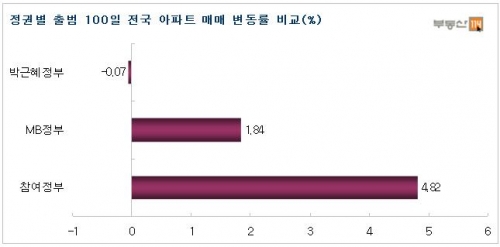 역대 정부 출범100일, 부동산시장 어땠을까. 참여정부 및 MB정부 모두 출범 100일 때 아파트 매매가격은 올랐다.
