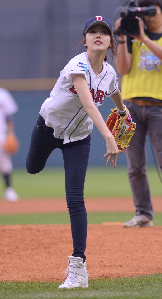 31일 오후 서울 잠실야구장에서 열린 2013 한국야쿠르트 세븐 프로야구 두산 베어스와 넥센 히어로즈의 경기에 앞서 탤런트 소이현이 시구를 하고 있다.
