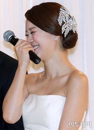 가수 백지영이 2일 오후 서울 광징구 워커힐 호텔에서 열린 결혼식 기자회견에서 취재진의 질문에 수줍게 웃고 있다. 방인권 기자 bink7119@