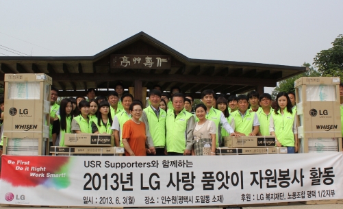 3일에는 LG전자 평택사업장 직원 40여명이 도일동 소재 노인복지시설인 ‘인수원’에 에어컨, 식기세척기, 냉온정수기 등 전자 제품을 직접 전달하고, 영정사진 촬영, 시설 청소 등의 봉사 활동을 진행했다.