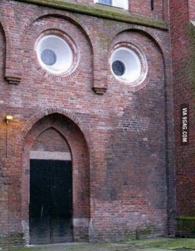 사진은 벽돌로 지어진 평범한 건물의 출입구 부분을 찍은 것이다. 출입구만 확대해 보면 특이한 것이 없지만 문 바로 위에 난 두 개의 창과 함께 앵글에 잡으면 얘기가 달라진다. 언뜻보면 사람의 눈ㆍ코ㆍ입으로 보이는데 특히 벌린 입이 돌아간 것처럼 보여 재미를 선사한다.