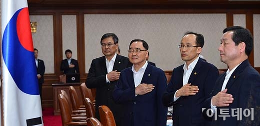 정홍원 국무총리를 비롯한 국무위원들이 4일 오후 서울 세종로 정부서울청사에서 열린 국무회의에서 국민의례를 하고 있다. 방인권 기자 bink7119@