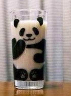 사진속에서 투명한 컵에 우유를 따르자 귀여운 팬더 한 마리가 수줍게 등장한다. 흰 우유를 따르면 컵의 빈공간이 채워지며 팬더의 흰 털과 같이 보이는 것이다.