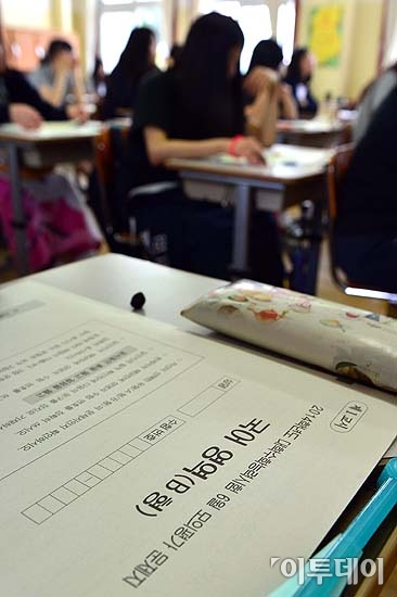 2014학년도 대학수학능력시험에 대비한 첫 모의고사가 실시된 5일 오전 서울 종로구 풍문여자고등학교에서 3학년 학생들이 문제를 풀고 있다. 6월 모의평가에 지원한 수험생은 재학생 57만2577명, 졸업생 7만3383명 등 모두 64만5960명이다.
