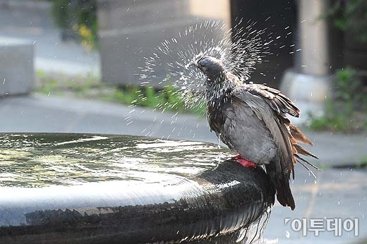연일 30도 안팎의 불볕더위가 이어지고 있는 5일 오전 서울 인사동 거리에서 비둘기 한 마리가 더위에 지친 듯 샤워를 하고 있다. 방인권 기자 bink7119@
